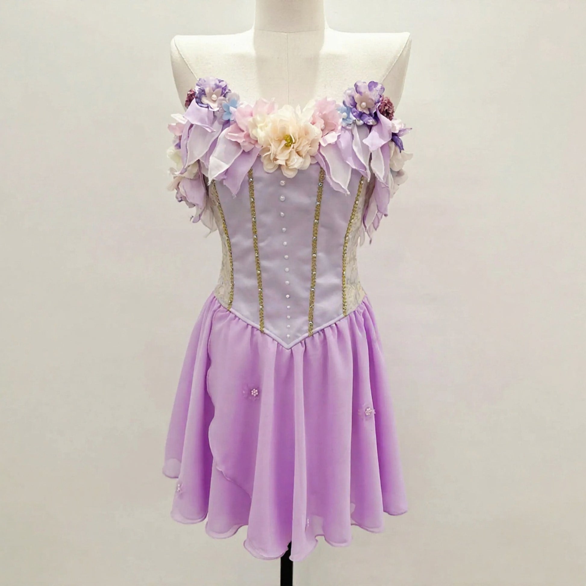 Lilac satin, V-shaped bodice, decorated with golden trims and with pastel flowers all around the neckline, front and back.