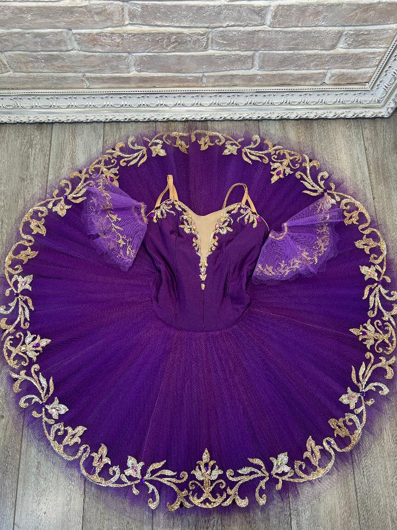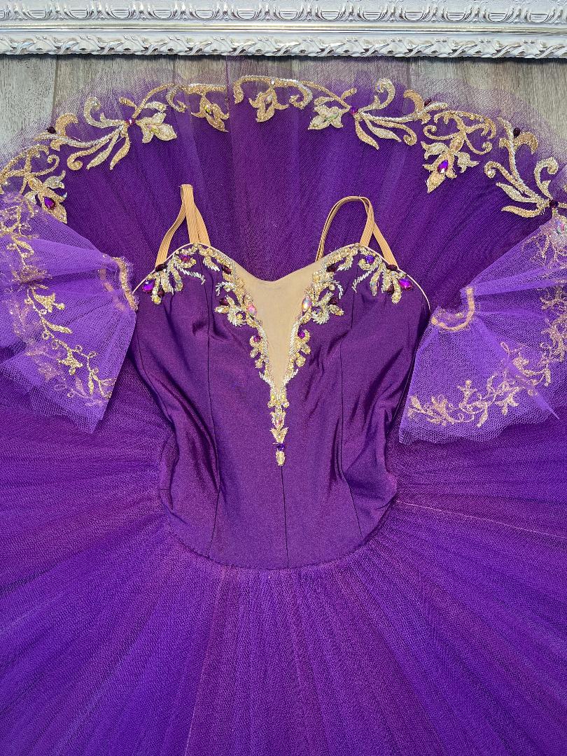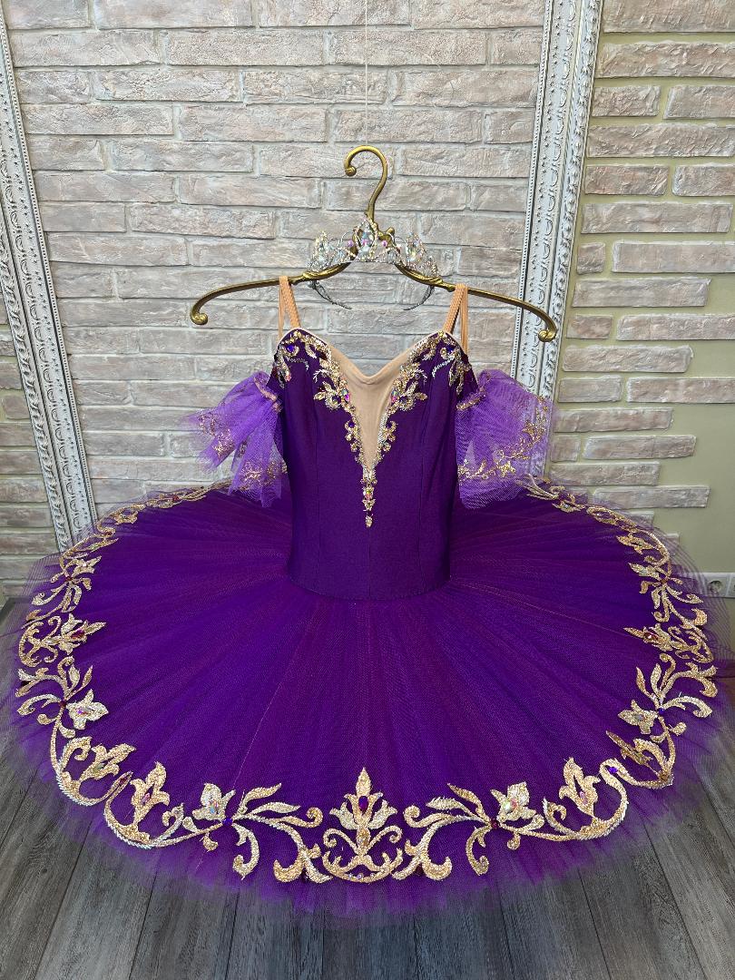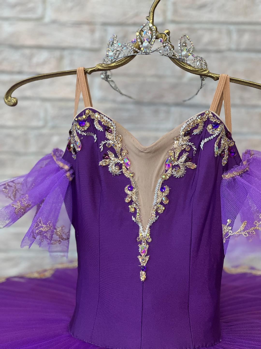 The pancake, 12 layers, hooped tutu skirt is made with high quality, violet tulle, and is decorated all around with gold appliques and violet crystals.