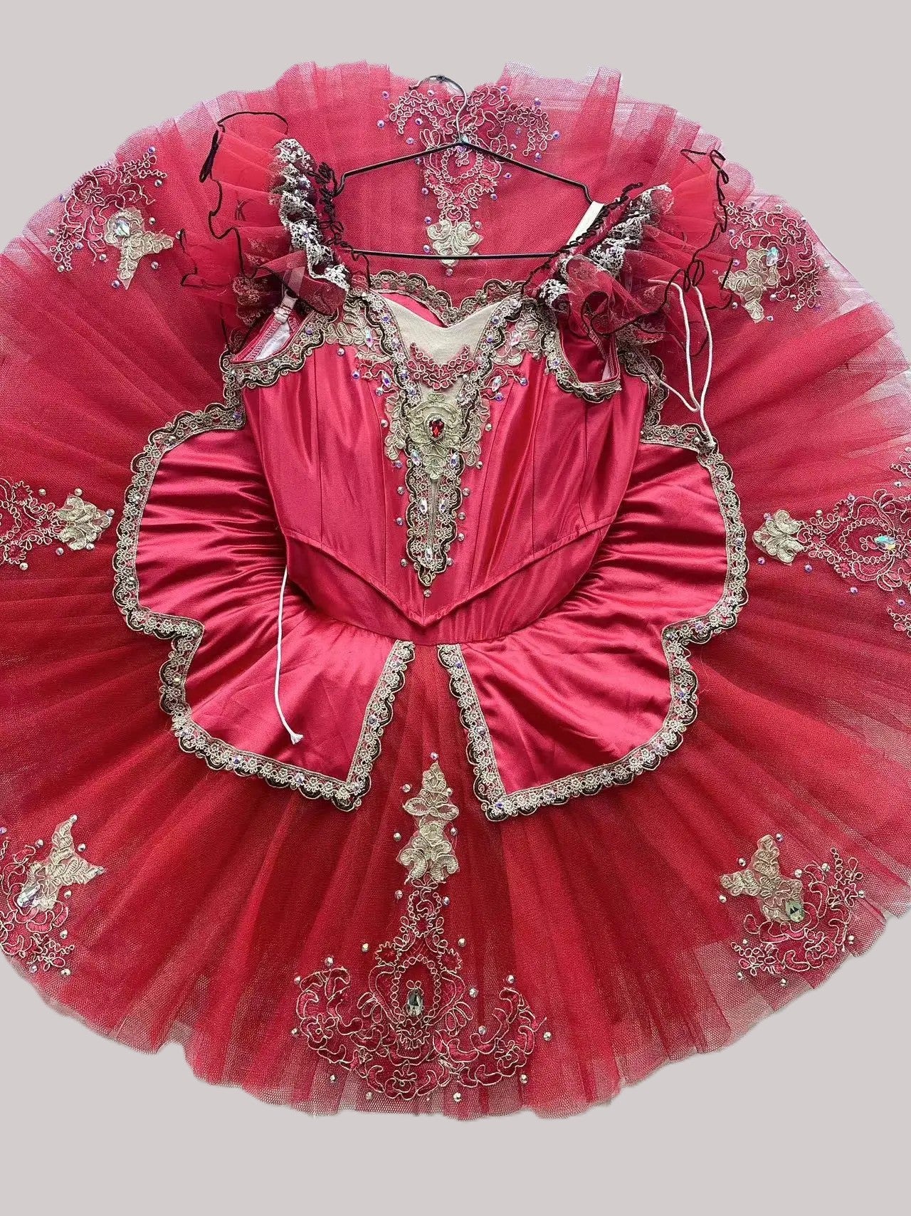 Bright red, professional pancake tutu for the role of the Finger Fairy in the ballet The Sleeping Beauty. This tutu can also be used in the ballet "Paquita", or "Kitri".