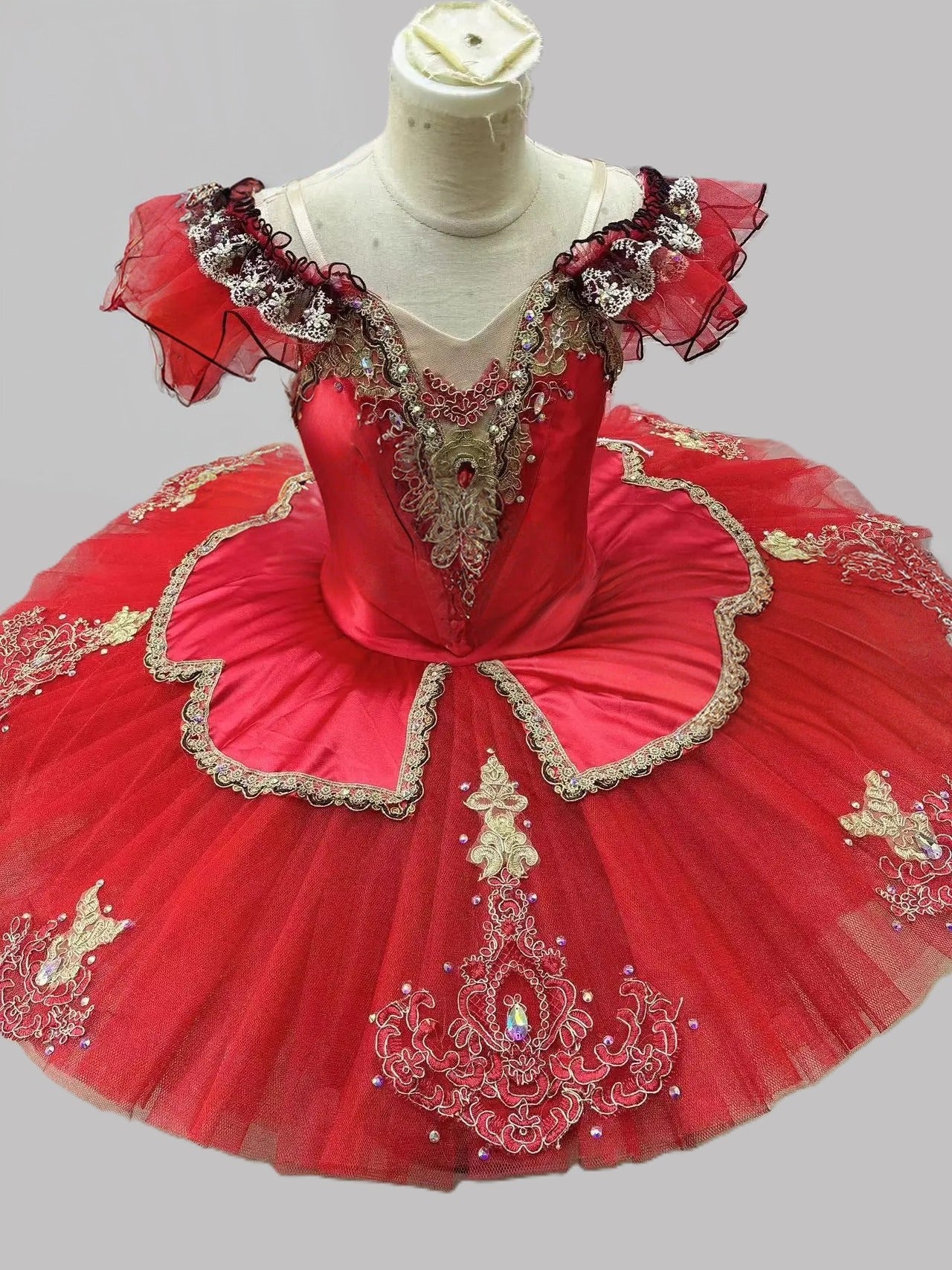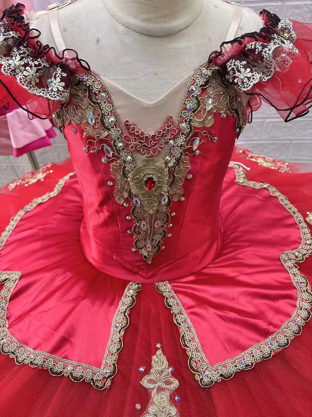 Professional, pleated ten layers tutu skirt, featuring a red satin tutuskirt with golden trims. The rest of the tutu skirt is decorated with gold and red appliques and crystals.