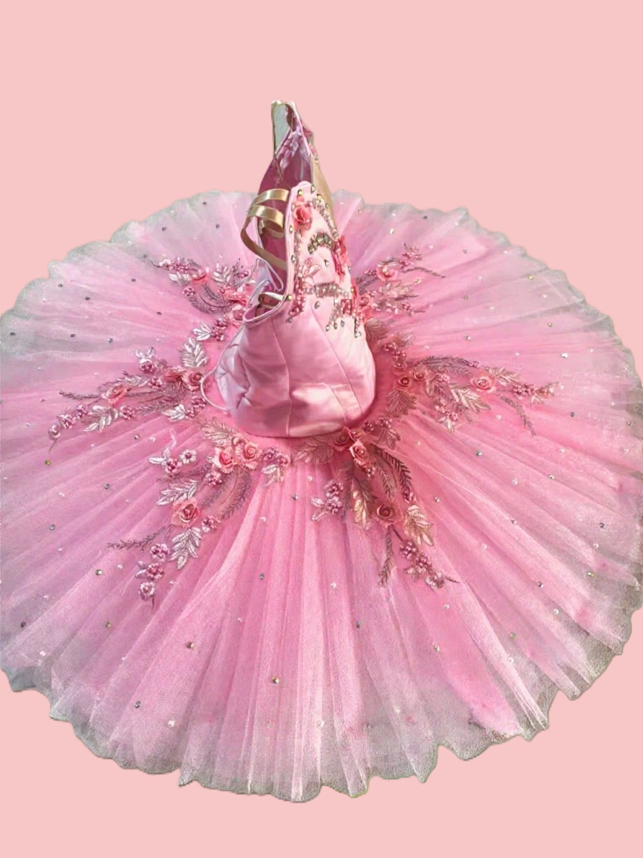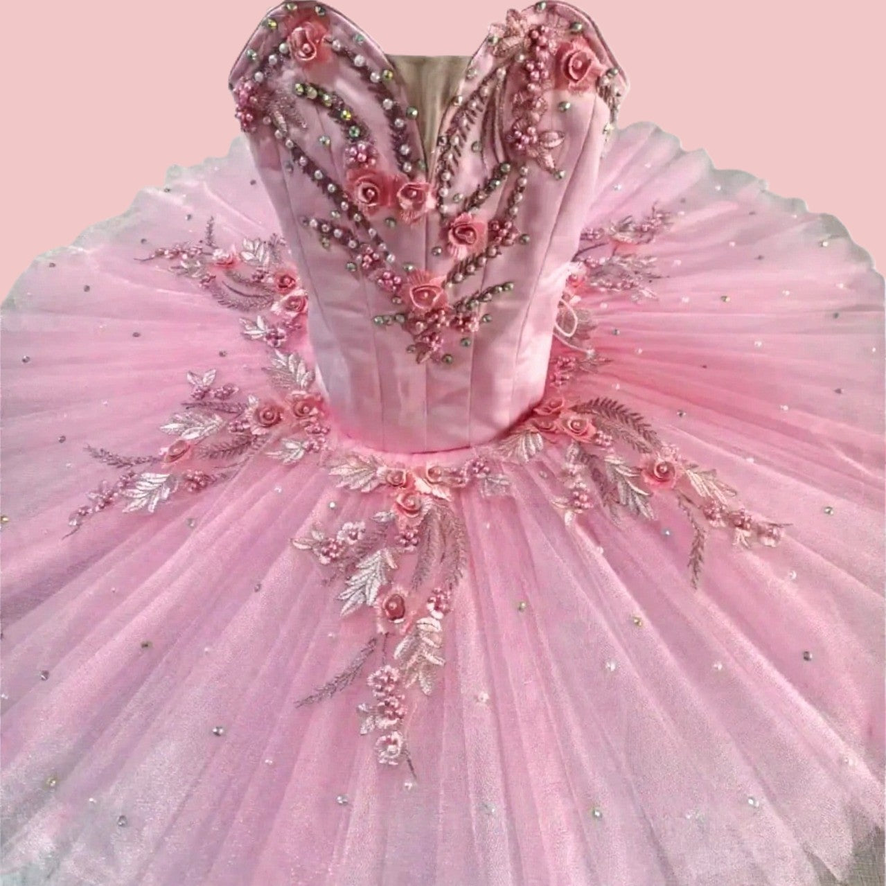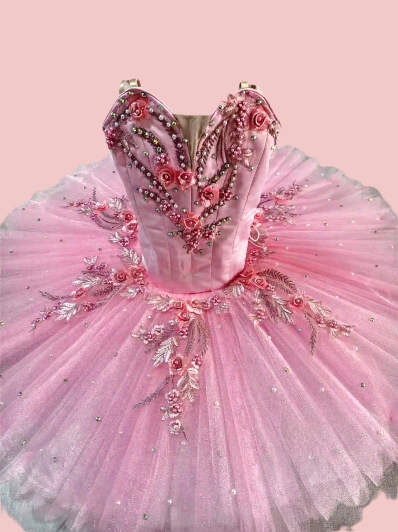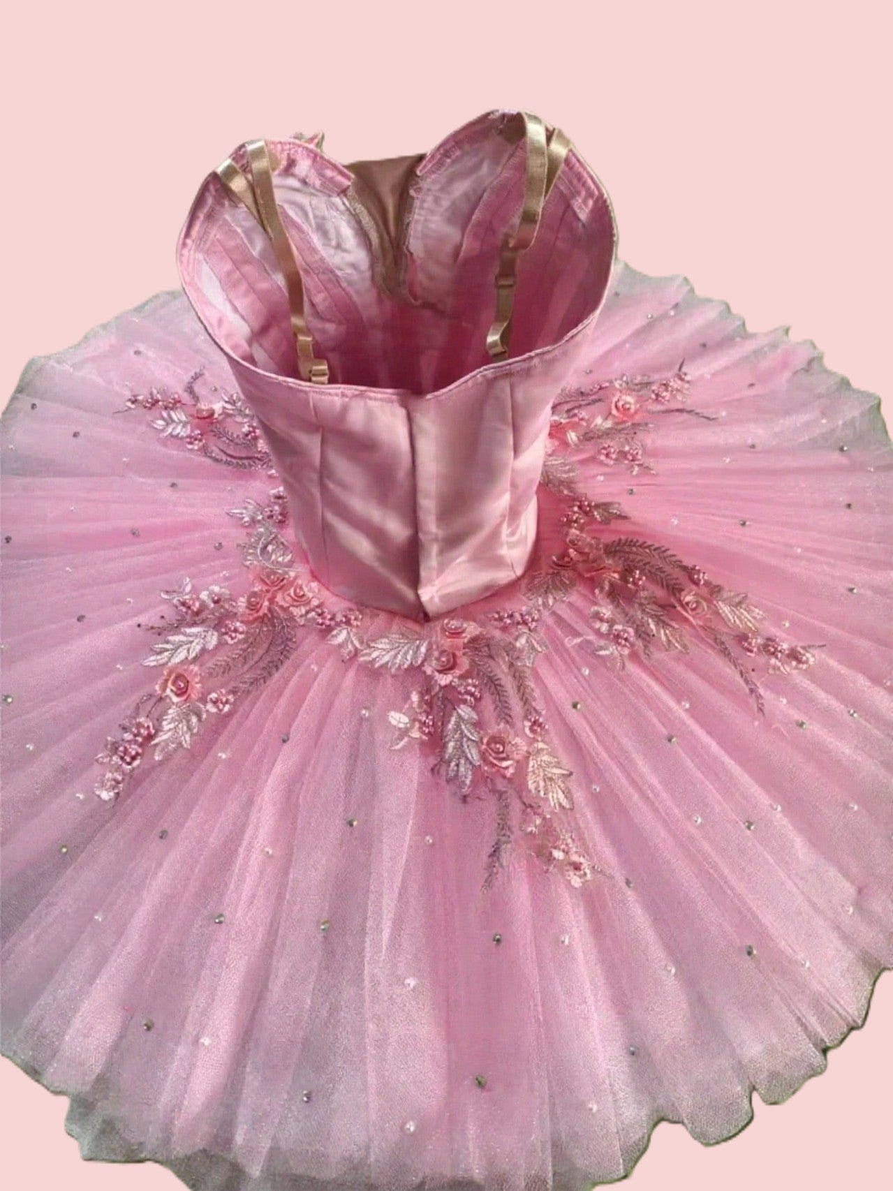 The platter skirt consists of 12 layers of pink and shiny white net. The bodice's same decoration theme is repeated on the tutu skirt, making this costume a real princess tutu.